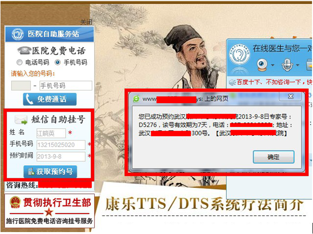 第一步:设计一个短信预约窗口(患者直接输入“姓名、手机号码”即可通过短信收到专家预约号,同时还可以享受相关的医疗政策)