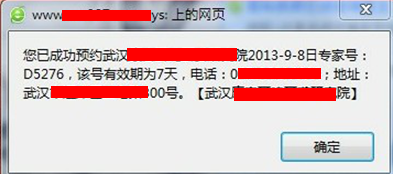 你已成功预约XX医院 2012-11-20专家号:D3952,该号有效期7天,电话:XXXX 地址:XXXXX