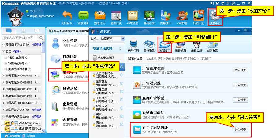 第一步:点击【设置中心】—【生成代码】—【对话窗口】—【自定义对话网址】