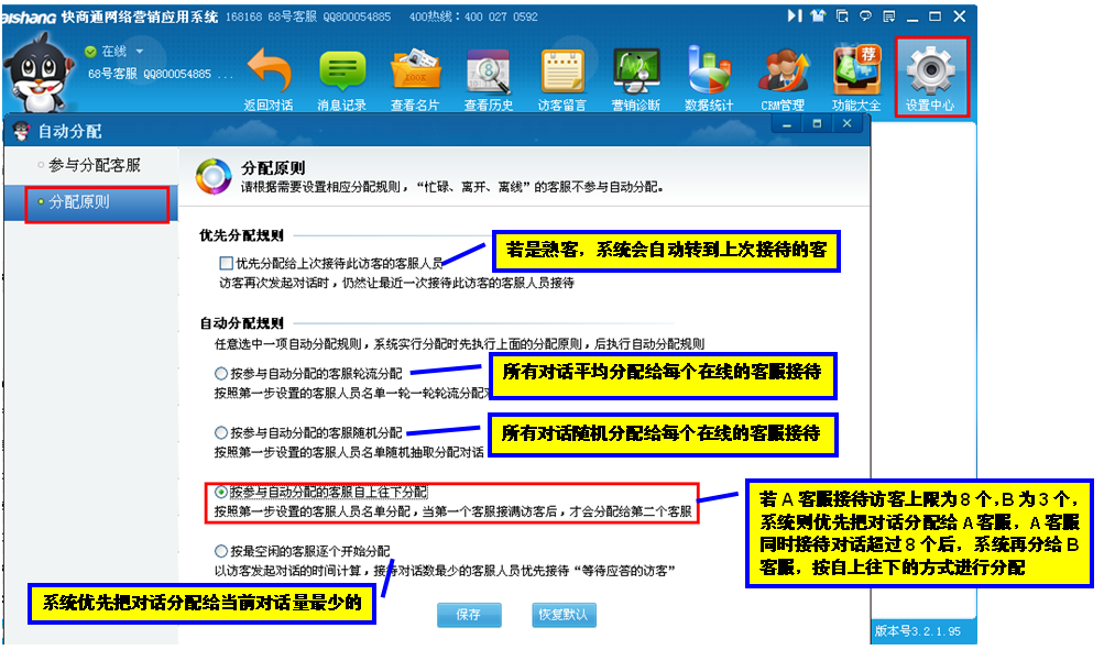 第二步:分配规则选择的是按【参与分配的客服自上往下分配】,详见如下图: