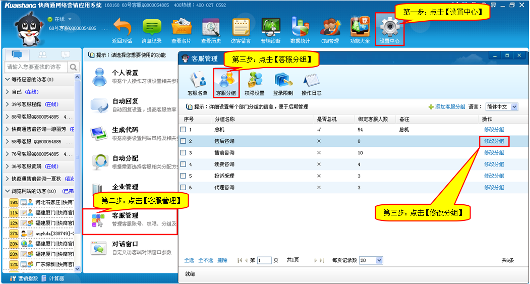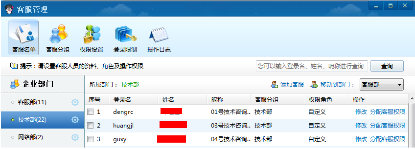 【设置中心】—【客服管理】—【客服名单】,见如下图: