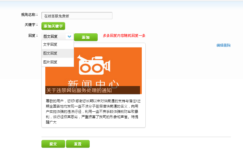 消息自动回复,指的是粉丝像企业发送信息时,自动回复信息,回复模式有文本、图文、图片等形式,设置方法与【关注时自动回复】是一样的。