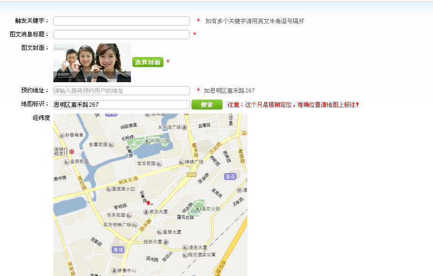 b.添加预约管理:点击【添加】预约 — 填写触发关键词、图文消息标题、图文封面、预约地址、地图标示、预约电话。