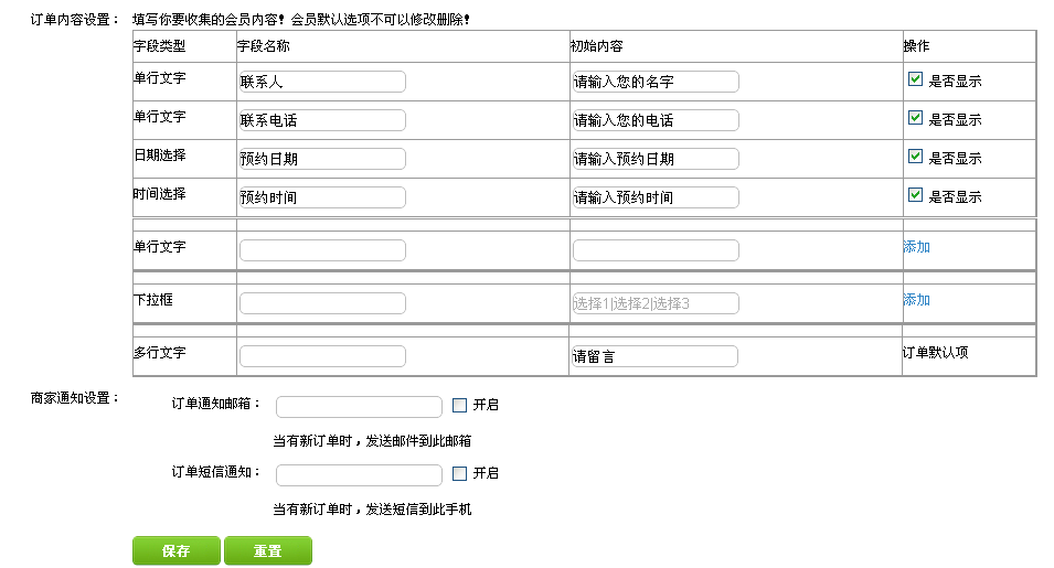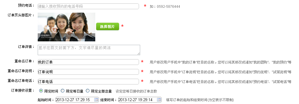 d订单内容的设置:编辑订单人员的信息、电话、预约时间、日期(支持添加多个订单),商家通知设置,包括订单通知邮箱是设置和订单短信通知设置(如果有新订单,则通过邮箱/短信发送到设置好的信息上)