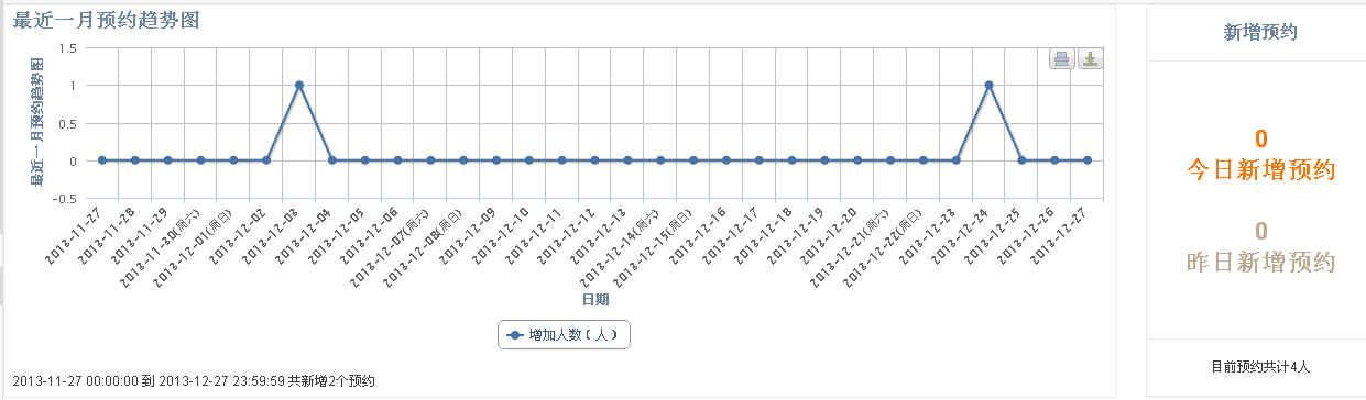 点击【预约统计】,可以查看最新一个月新增预约的趋势图,点击坐标上的小圆点可以查看到每日的订单人数,最右侧的方框内会显示【今日新增人数】、【昨日新增预约人数】和【目前预约总人数】。