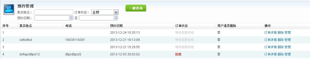 实时查看预约详细信息,包括客户的真实名字、电话、预约日期、订单状态、以及一些相关操作。