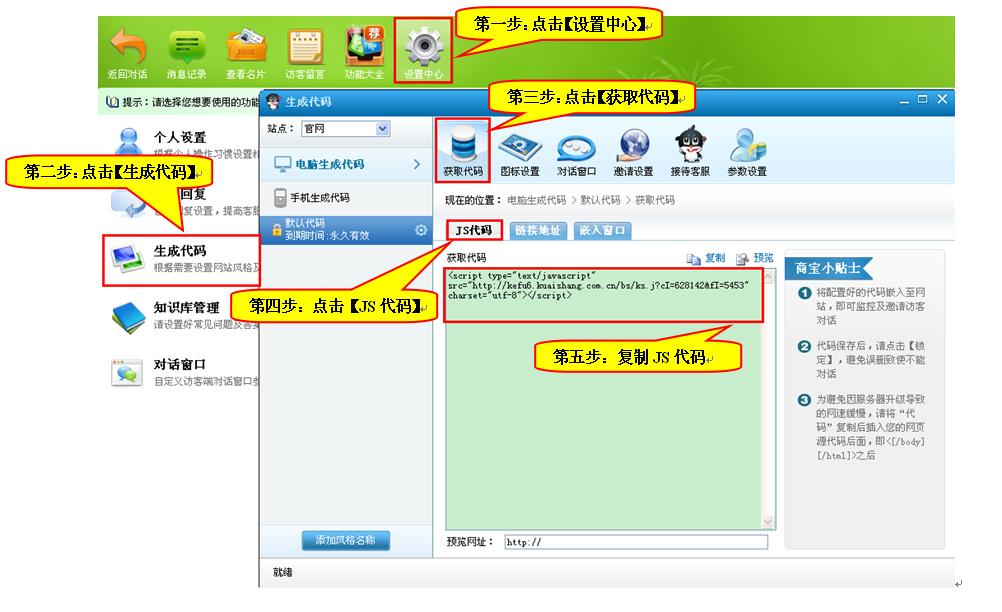 注意: 1)请确认您的网站每个页面是否都放了快商通的JS代码,且为正确放置。