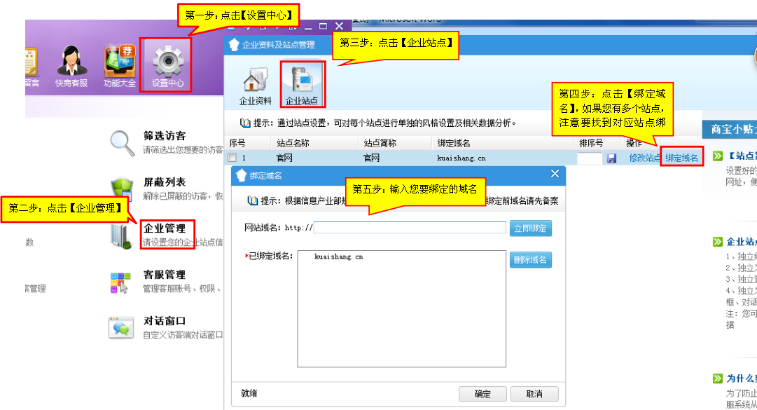 操作流程:设置中心——企业管理——企业站点——绑定域名