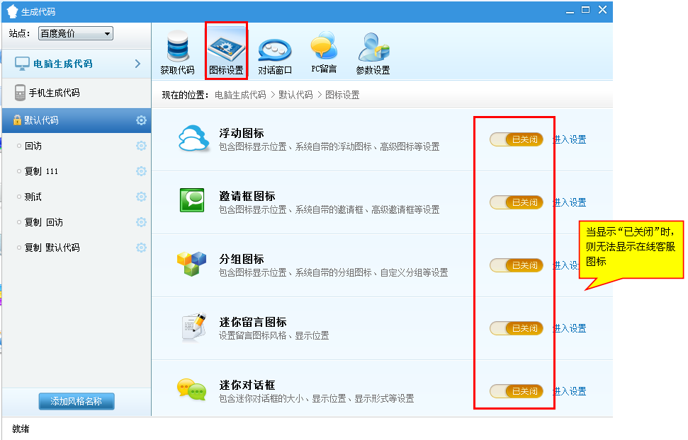 操作流程:进入快商客户端——设置中心——生成代码——JS代码,与“网页源代码”是否一致,若不一致,则 无法显示在线客服图标。