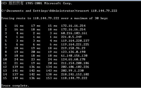 第三步:在弹出的框内输入“tracert 118.144.79.222” 然后“回车”,出现下图的大量的数据,并且不间断;