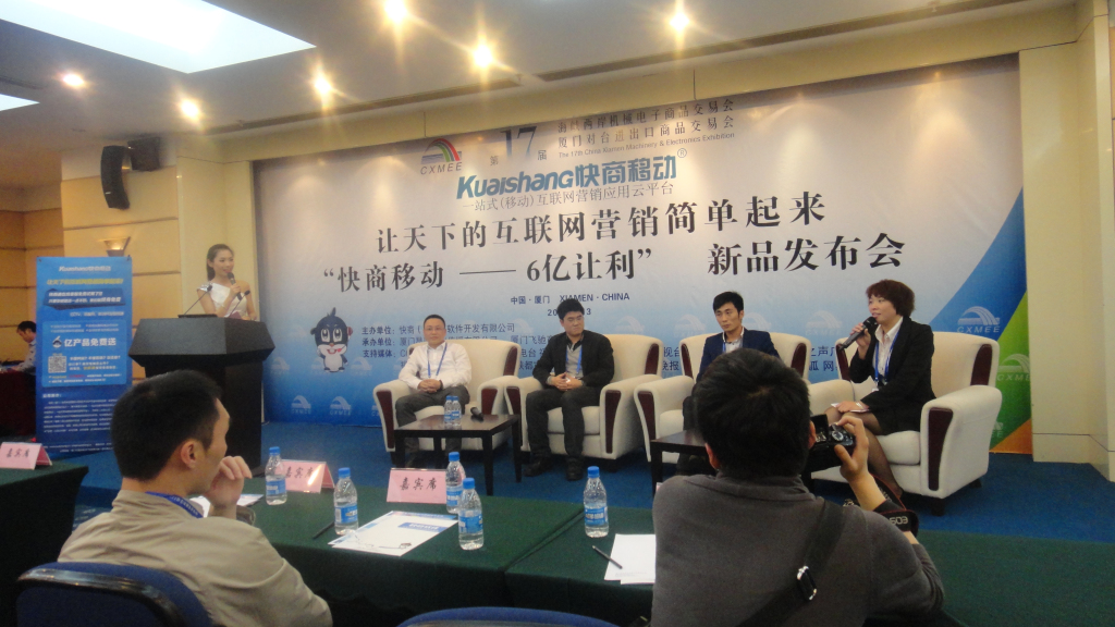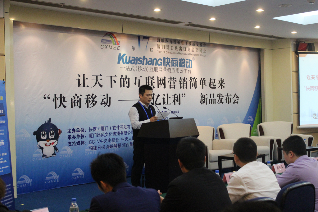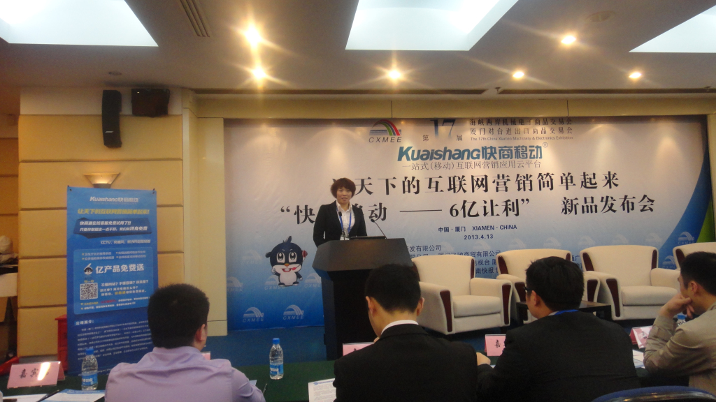 4月13日下午,由中华人民共和国商务部、科技部 、国家质检总局、国台办、国家机电办、福建省人民政府支持,厦门市人民政府、快商(厦门)软件科技有限公司共同主办的2013“快商移动——6亿让利”新品发布会暨互联网营销沙龙交流会在厦门国际会展中心隆重召开,快商公司董事长肖龙源等相关单位领导出席发布会并发表重要讲话。