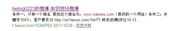 从上面的分析可以得出,微博是可以被百度收录的,并且可以得到很好的排名(谷歌在之前就已经说明,谷歌已经考虑微博在谷歌搜索结果中的排名)。仅凭这两点,微博就可以成为seoer者的一套法宝了,但是博石石头想告诉大家,微博seo远远不局限于此,下面我们就继续看一个例子。