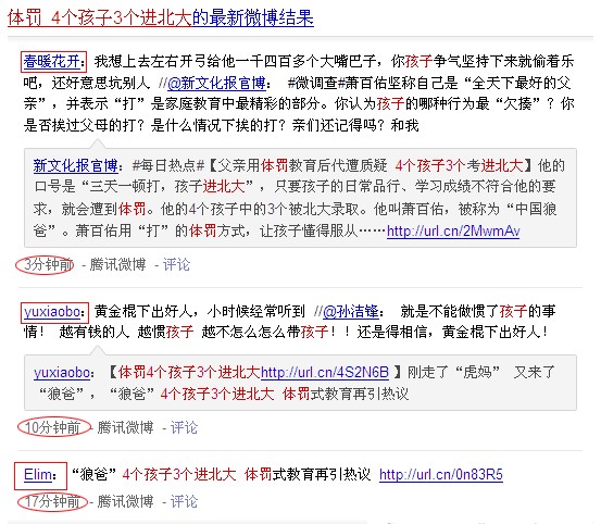 我们在百度搜索框中输入“体罚 4个孩子3个进北大”,得出下图信息