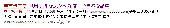 通过凤凰快博我们发现春节汽车票这个长尾词排在首页,可以看出凤凰产品的权重之高。我想向大家传递利用互联网老大推出的新产品的平台推销我们的产品,及时关注互联网大佬推出的新产品,利用走向完善的期间推销我们的产品。
