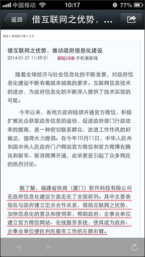 2014年1月,刚刚进入新的一年,快商公司就频频传来佳音。通过招标,快商(厦门)软件科技有限公司从众多竞标企业中脱颖而出,成为“政府信息化建设”定点合作商。