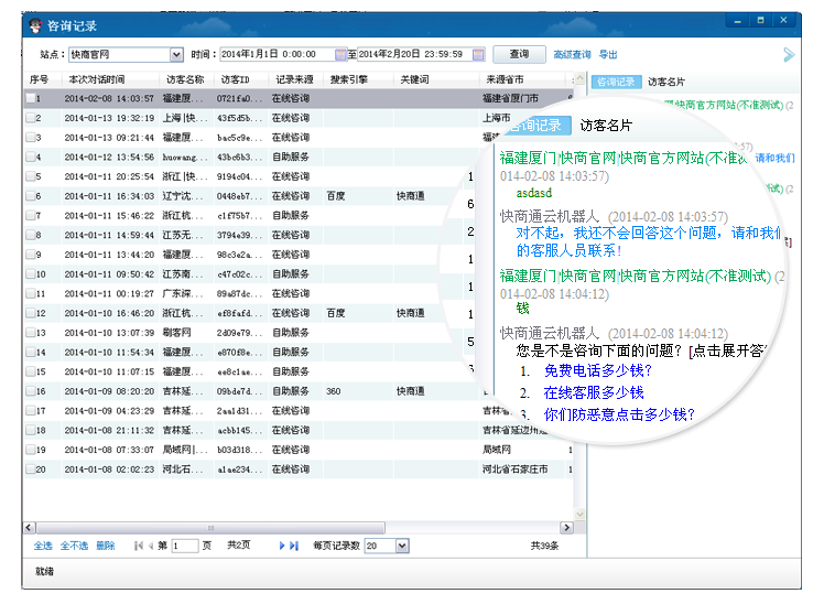 客服人员可实时查询机器人接待的消息记录,进一步提高客服人员与机器人的相互配合关系;另外客服人员只要通过调取自动服务功能内的消息记录,可第一时间筛选意向客户,进行二次沟通!