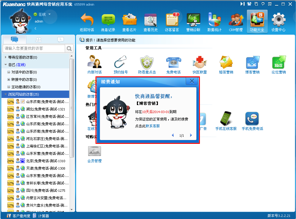 快商通实现自动提醒功能到期服务功能,只要企业某个功能即将到期时,系统都自动为您提醒续费
