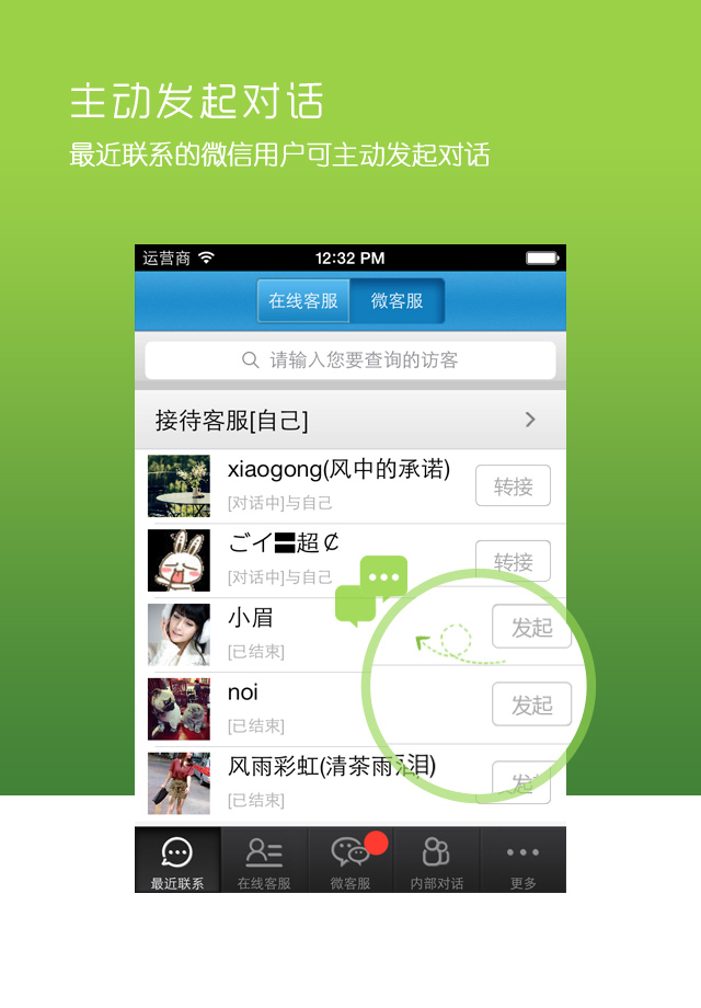 Iphone版微客服一样可实现主动发起对话功能,48小时内联系过的微信客户可以进行再次对话,时刻跟踪访客的购买动向。