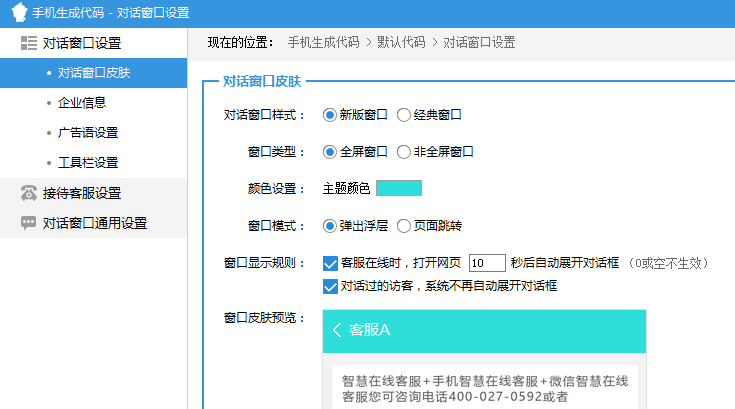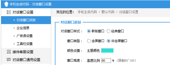 1、全新的访客端窗口样式,提高手机访客端的体验度 2、手机端支持『非全屏窗口』,可在后台选择非全屏窗口类型并自定义窗口高度,方便访客在与客服对话的过程中也能够浏览网站中的内容,减少访客切换窗口时的时间浪费,也有效降低企业的对话流失风险 3、手机端的后台将会有更多的个性化配置,新增的功能如下: l 『自定义主题颜色』,可结合网站风格设置相应颜色,让它更契合您的网站风格 l 『浮层窗口』模式,提高了访客切换对话框的流畅度 l 『自动建立对话』,可设置手机端访客进入网站后在指定时间内自动展开对话框,帮助客户建立起更多的对话商机
