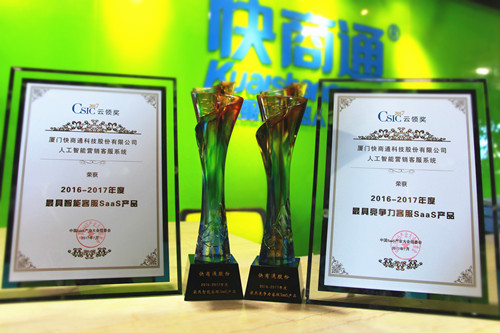 为期两天以“云时代 新契机”为主题的2017中国SaaS产业大会于上海圆满落幕,快商通凭借以AI为核心的人工智能营销客服系统荣获“年度最具竞争力saas服务商奖”“年度最具智能saas产品奖”两个重量级奖项,成为当天会场备受瞩目的耀眼明星。