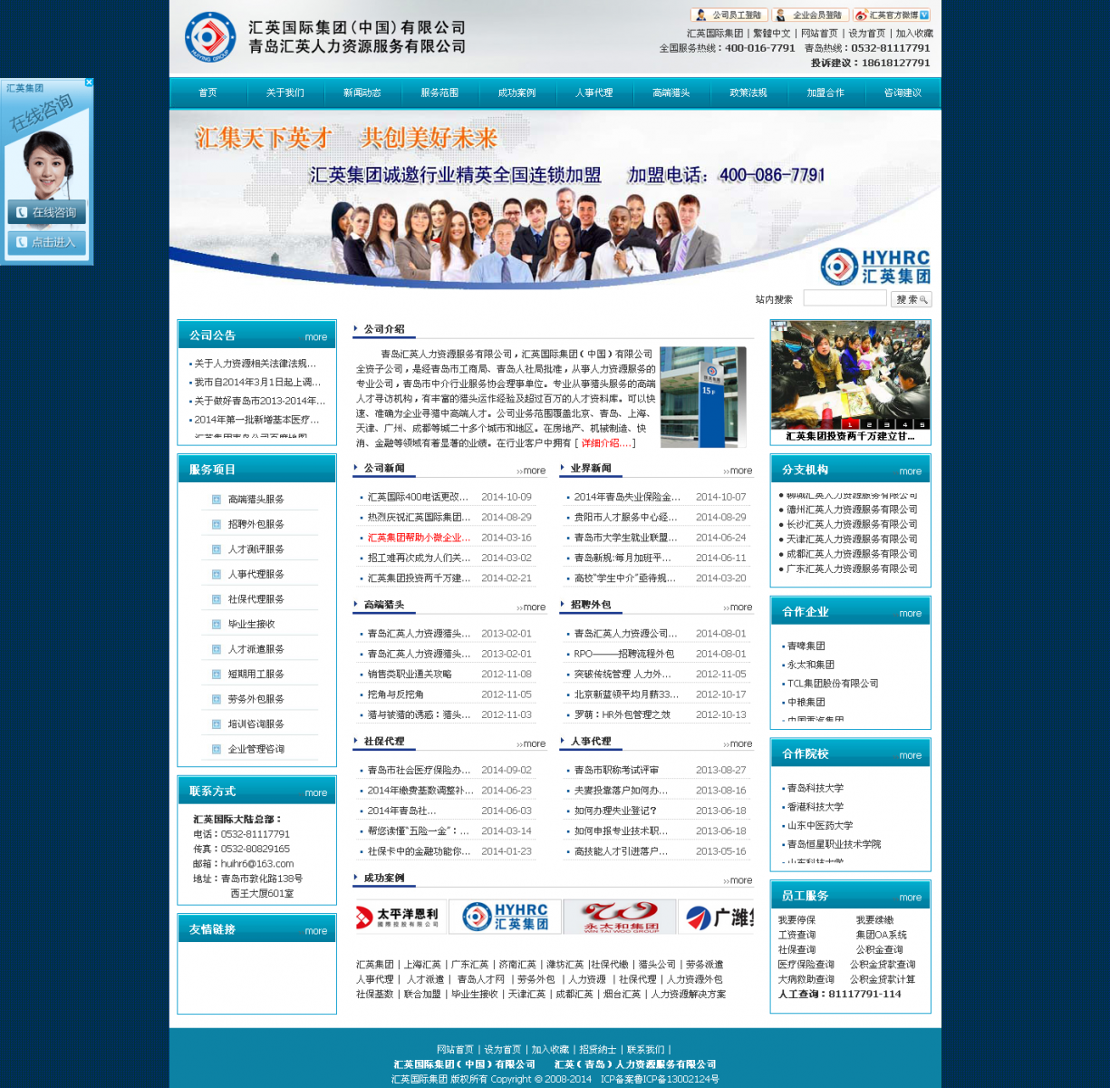 汇英国际集团(中国)有限公司创建于2001年,是国际人力资源管理协会(SHRM)会员单位,专业致力于为企业提供全方位管理咨询、人力资源战略规划,为个体人才提供职业化发展管理等服务。 汇英集团利用先进的管理模式,与国内各行业领域的相关专家、学者、职业经理人以及优秀的人力资源专家、职业规划师、企业人力资源高层管理组成一支具有中国特色的专业咨询团队,联手建立了一套标准化、科学化、流程化、本土化的适应中国企业发展的人力资源综合服务体系,迄今为止已为数千家企业提供了全方位、高质量服务。