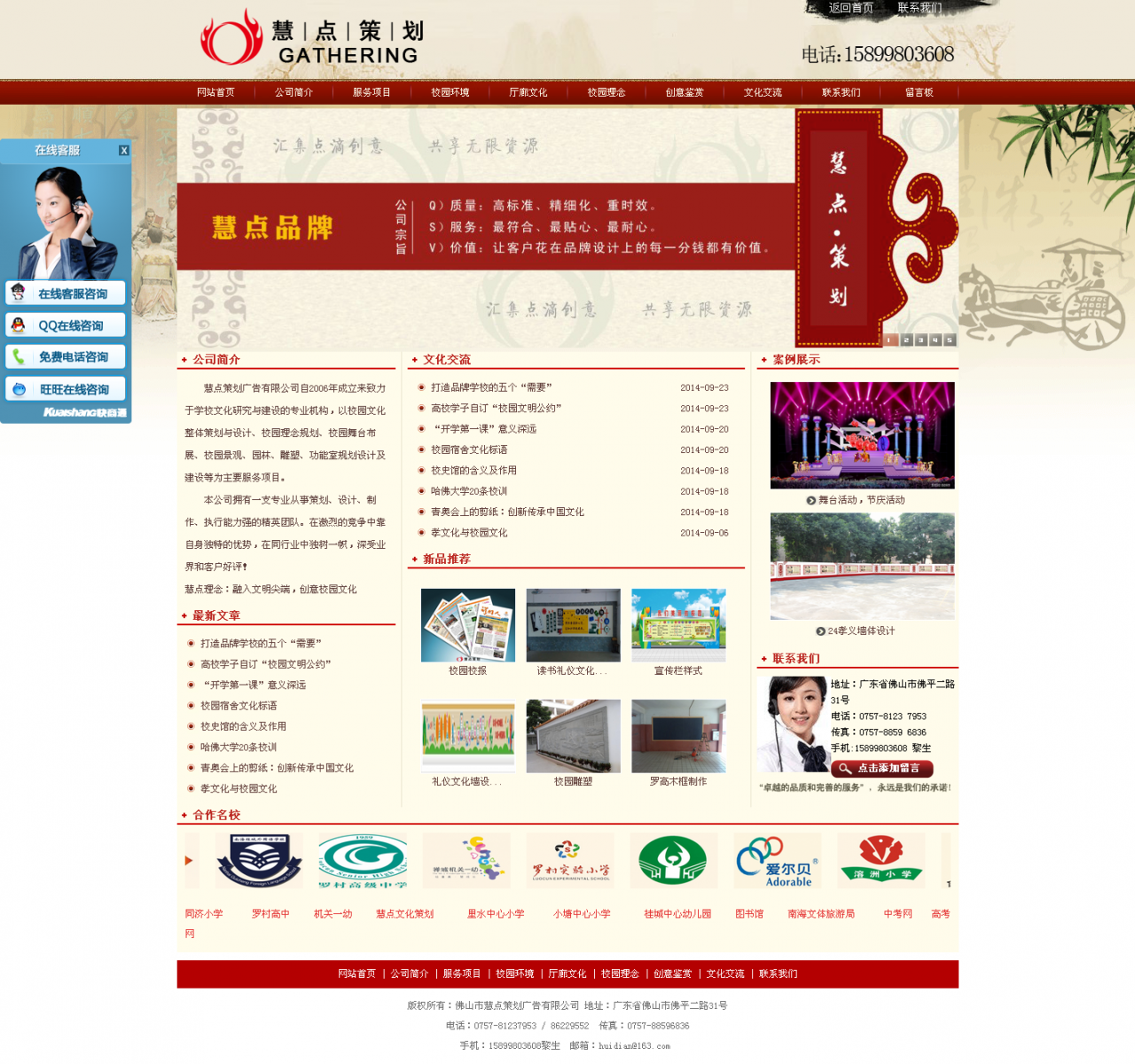慧点策划广告有限公司自2006年成立来致力于学校文化研究与建设的专业机构,以校园文化整体策划与设计、校园理念规划、校园舞台布展、校园景观、园林、雕塑、功能室规划设计及建设等为主要服务项目。