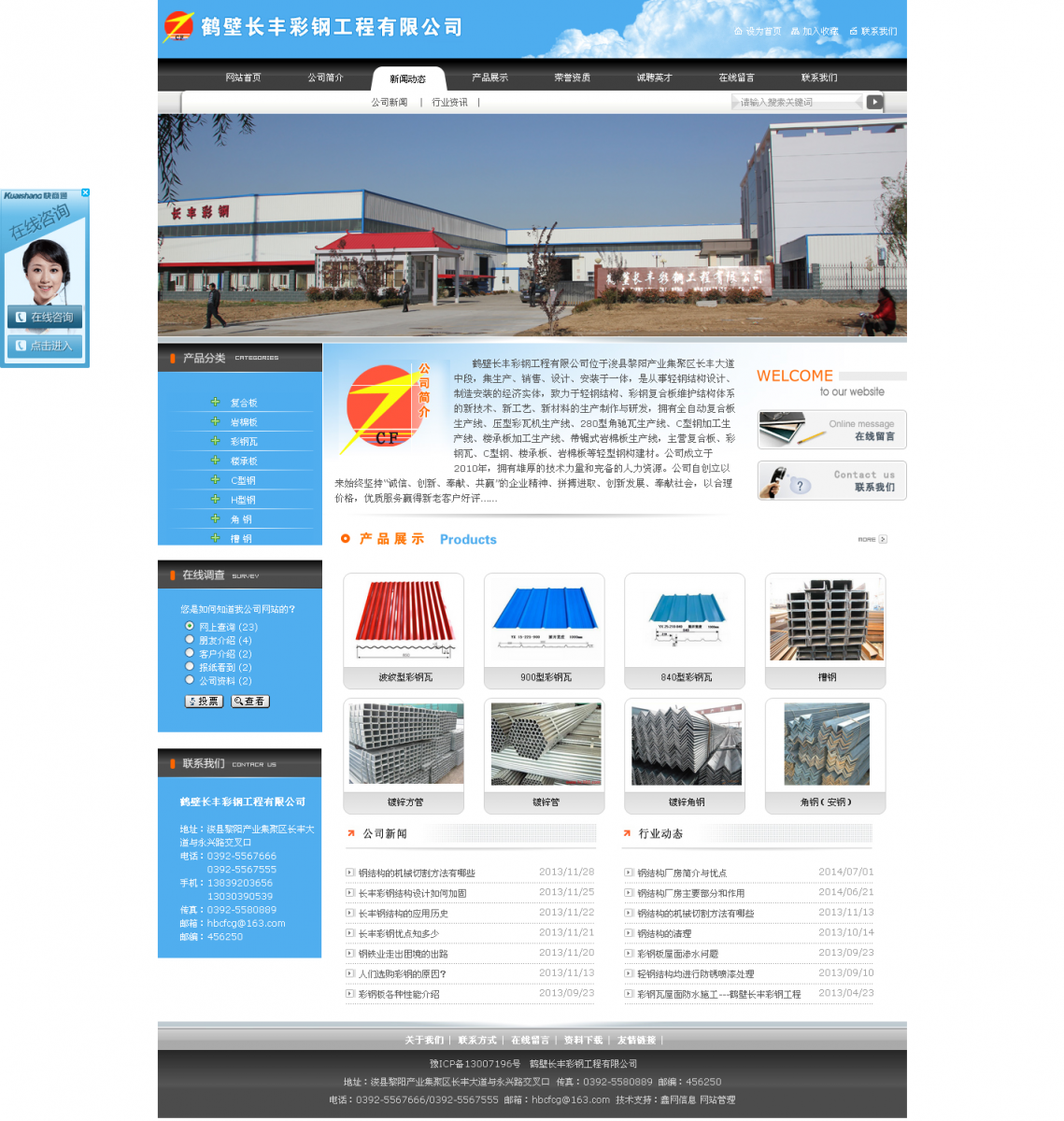 公司常年从事钢结构工业厂房、冷库、制药车间、净化房、彩板组合(活动房)的设计、制作和安装,销售复合板、岩棉板、彩钢瓦、楼承板、C型钢、H型钢。