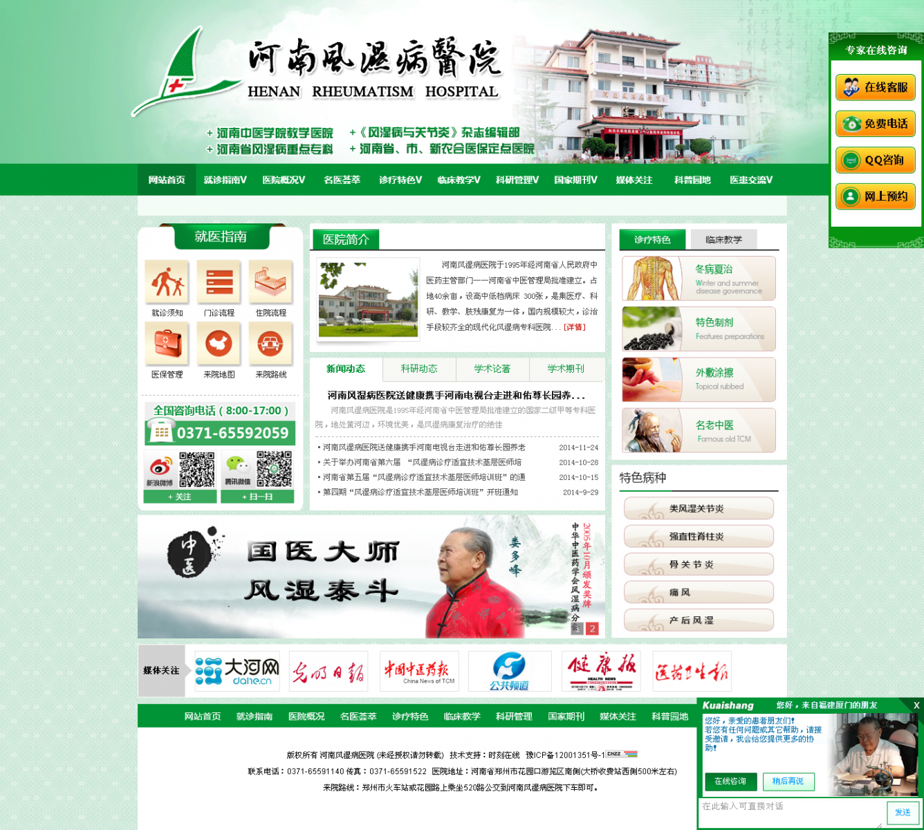 河南风湿病医院于1995年经河南省人民政府中医药主管部门—河南省中医管理局批准建立。地处历史胜地—郑州市花园口,北依黄河,东邻107国道,占地40亩,建筑面积16000多平方米,设高中低病床300张,职工120多人。她的前身是河南中医学院风湿病研究所,医院是在娄氏治痹(顽)症百年经验的基础上,在党和政府发展中医药、挖掘名老中医药专家经验政策的大力支持下,为满足风湿病患者的治疗而创建的。伴随着我国改革开放步伐,医院已走过了十年多的风风雨雨艰苦创业的历程,在创始人娄多峰教授及其学术继承人娄玉钤院长带领下,全院职工齐心协力,开拓进取,每一步脚印都深深体现了娄多峰教授的艰苦创业,高尚的医德医风及“一切为了病人”的办院宗旨和“弘扬祖国医学,提高生命质量”、“争创一流,与国际接轨”的办院方针,终于走出一条创新发展之路。奇迹般的建成一所人才荟萃、布局合理、设备先进、设施齐全、环境幽美,仿古建筑群的集医、教、研、康复为一体闻名国内外的现代化中医风湿病专科医院。