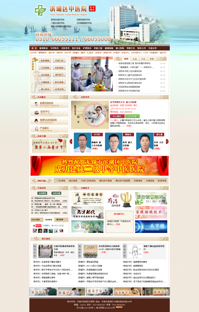滨湖区中医医院是区政府下属公立医院,医院始建于1958年,1990年由省卫生厅批准为无锡县中医院,1994年被评为一级甲等医院,由于区划调整,2001年更名为滨湖区中医院,2009年经区政府批准易地新建, 2012年10月,新地址正式启用,2014年12月,正式被评为二级甲等中医医院。历经半个多世纪的积累和沉淀,汇聚了人才,发展了技术,强化了内涵,成为了一所中医特色突出,中西医结合疗效佳的中医医院,取得了显著的社会效益和经济效益,先后成为南京中医药大学实习医院、无锡市卫生职业技术高等学校教学基地、澳大利亚弗林德斯大学医学管理研究生教学基地。